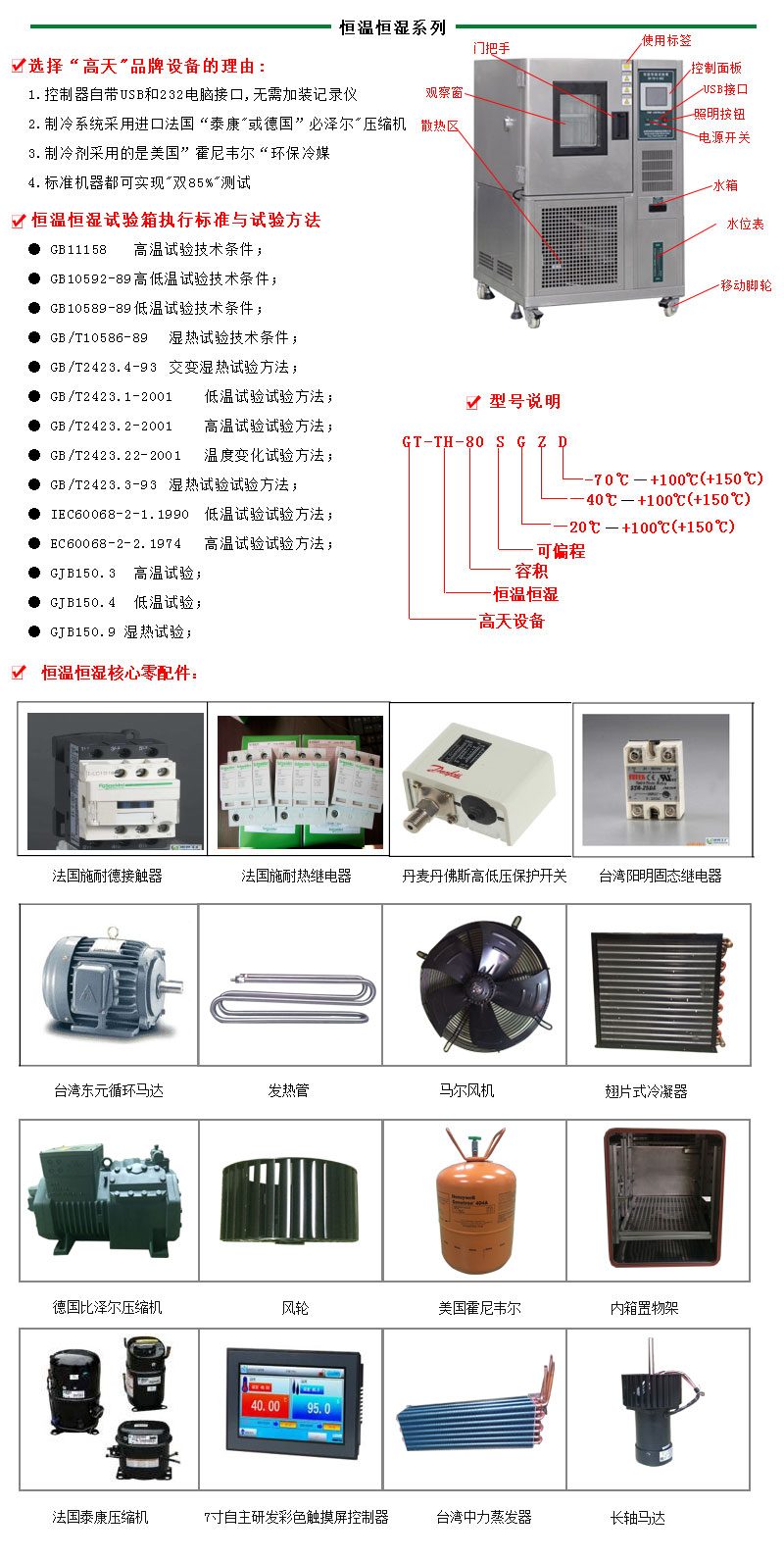 8.由控制面板、配电盘、保温隔层、送风机、加热器、加温器、冷冻机组合而成,主要规格可区分为7种标准尺寸及10种不同条件之规范。